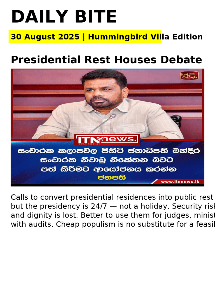 Daily Bite– Hummingbird Villa Edition-ජනාධිපති මන්දිරයේ සිල්ලර කතා සහ රාජ්‍ය ගෞරවය